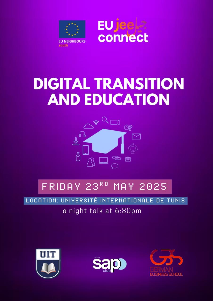 Tunis, 23 May 2025 — The International University of Tunis (UIT) had the pleasure of hosting the latest edition of Night Talk in partnership with the network of EU Jeel Connect Tunisia, the interactive evening debate dedicated to one of the most significant issues of our times: Digital Transition & Education.
