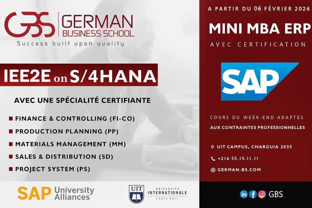 La German Business School vous propose un Mini-MBA en ERP "Enterprise Resource Planning", avec une Certification SAP. La formation complète en intégration des processus de gestion qui débutéra le 21 février 2025 et sera dispensé par quinzaine les vendredis et samedis.